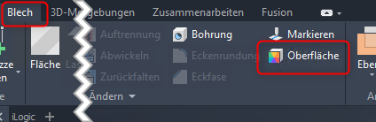Es wird der Befehl: "Oberfläche" der Ribbon-Gruppe "Blech/Ändern" hinzugefügt.